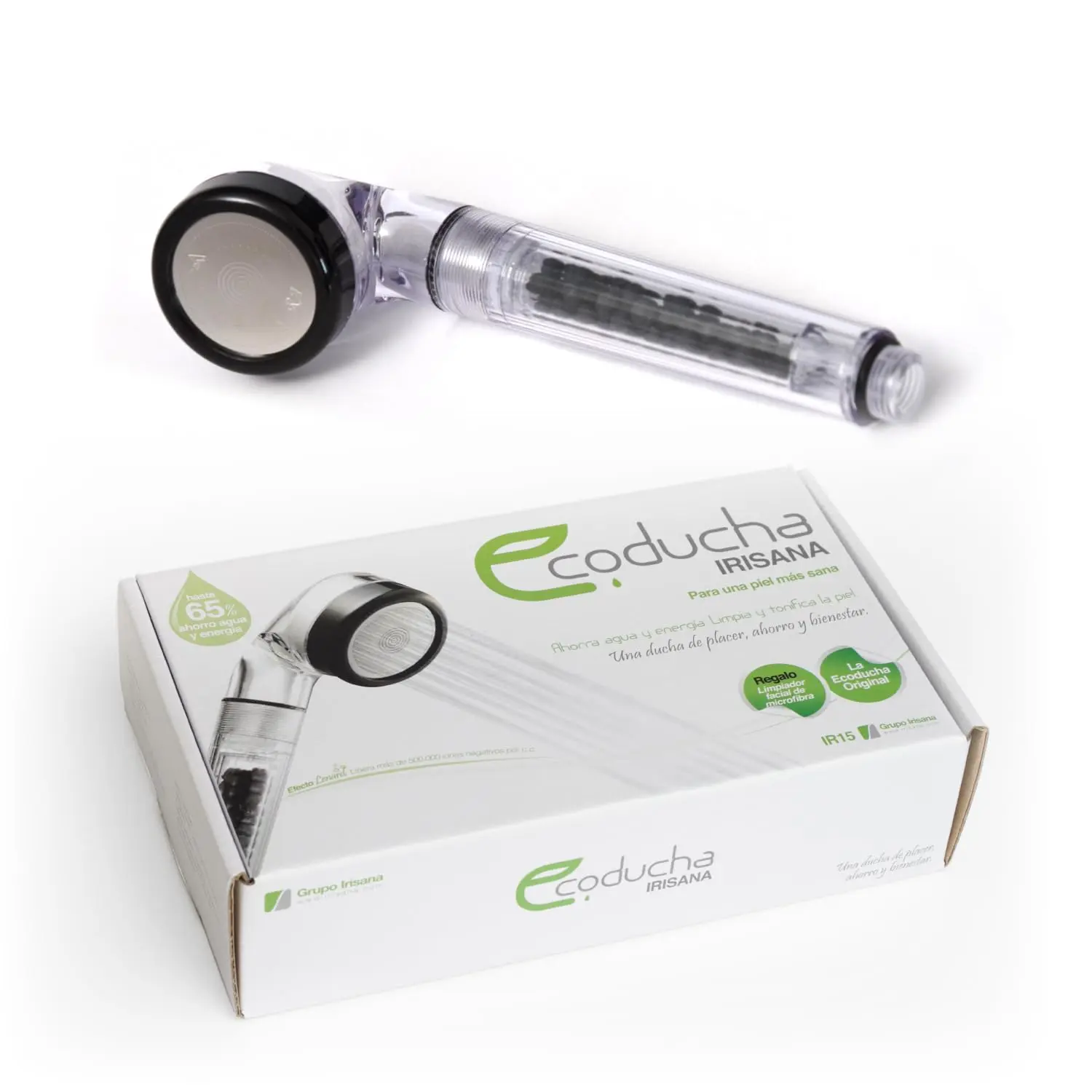 La Ecoducha Irisana está diseñada para transformar la calidad del agua en el baño y cuidar la piel y el cabello con cada uso. Este sistema integra: un cabezal con un disco de 412 microporos que micronizan el agua liberando iones negativos; un filtro cerámico de alta tecnología que suaviza el agua, reduce cloro y elimina olores; y un filtro de partículas que elimina sedimentos, arenas u óxidos presentes en el agua.